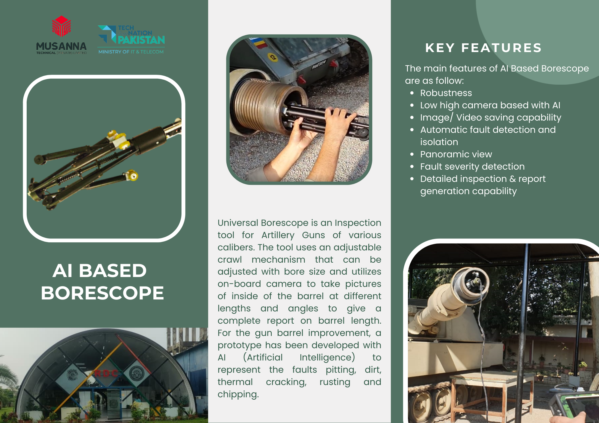 Universal Borescope is an inspection tool for Artillery Guns of various calibers. The tool uses an adjustable crawl mechanism that can be adjusted with bore size and utilizes on-board camera to take pictures of inside of the barrel at different lengths and angles to give a complete report on barrel length.
