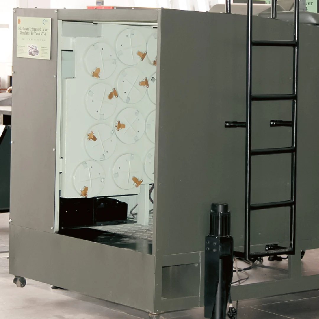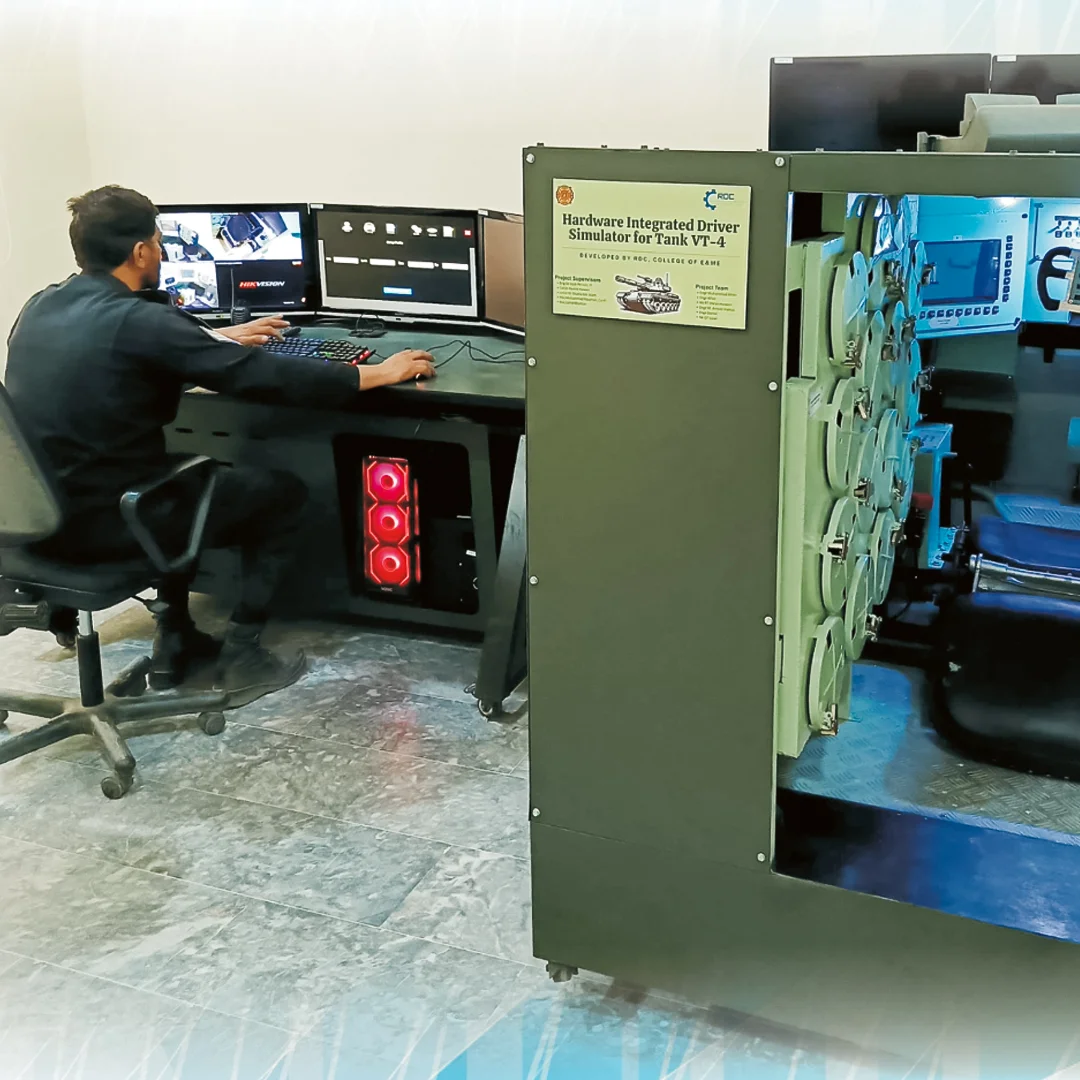 The system replicates multiple terrains, including desert, semi-desert, and mountainous landscapes, providing a comprehensive experience of operating a tank in various combat and non-combat scenarios. Performance is closely monitored through a live camera feed, allowing for real-time assessment. The instructor console evaluates the operator's performance, ensuring accurate feedback during tasks such as loading the tank onto a transporter and maneuvering in different terrains. This setup offers an immersive and dynamic training environment for tank operators.