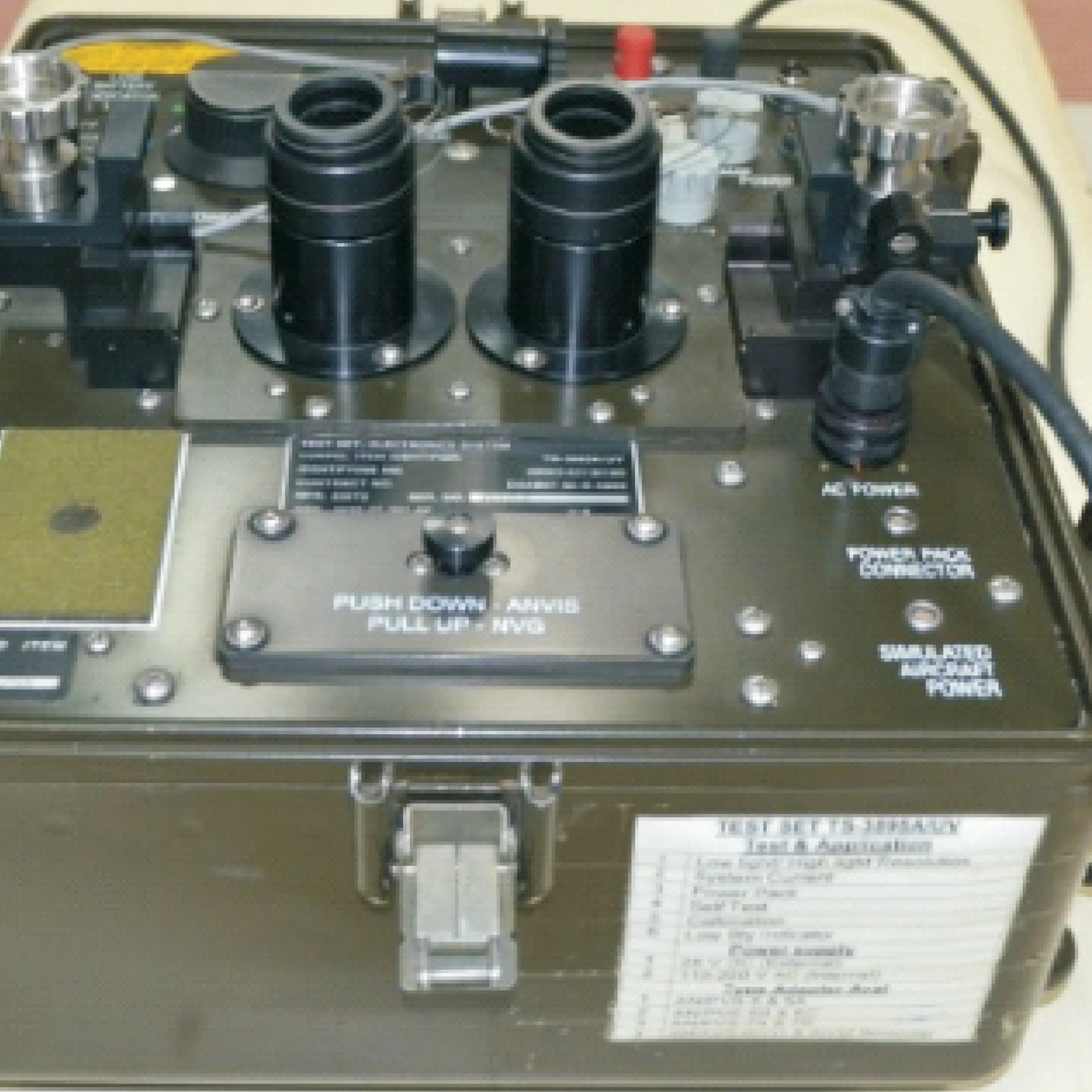 Our repair and calibration services include the use of the TS-3895A/UV Test Equipment, a precision diagnostic platform for evaluating the operational health of Night Vision Devices (NVDs). This test bench enables accurate testing of key functional parameters, including low and high light resolution, system current, collimation, low battery indication, and overall power integrity